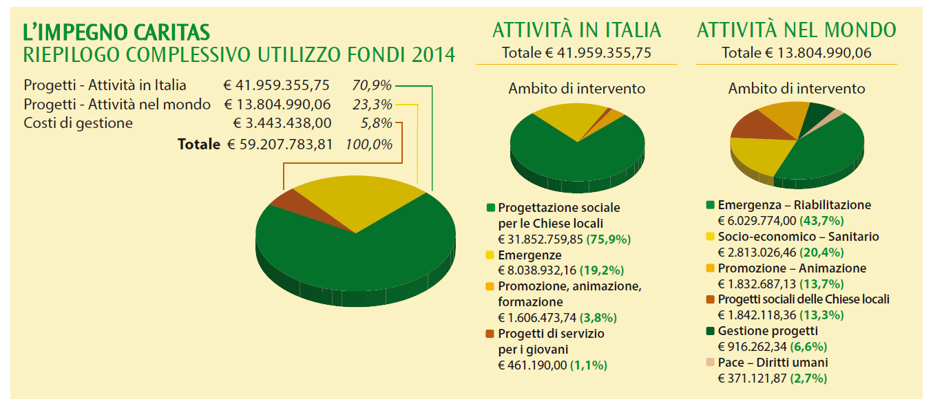 Il 2014 è stato un altro anno ricco di impegni e di attività "verso le periferie esistenziali" per Caritas Italiana, che nella giornata in cui l'ISTAT diffonde i dati sulla Povertà in Italia, pubblica un dépliant riepilogativo sull’utilizzo dei fondi e alcuni esempi d’intervento in Italia e nel sud del mondo.