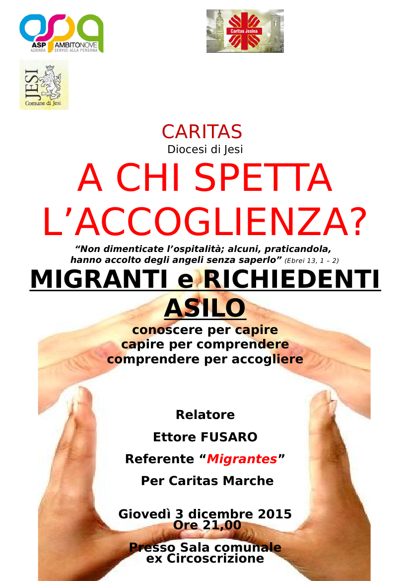 L’incontro, dal titolo "A chi spetta l'accoglienza?", si terrà giovedì 3 dicembre alle ore 21 a Jesi presso la sala Comunale ex Circoscrizione, in via San Francesco. L’evento, patrocinato dal Comune di Jesi, è esteso alla cittadinanza intera, alle Forze dell’Ordine, associazioni e gruppi interessati all’argomento.